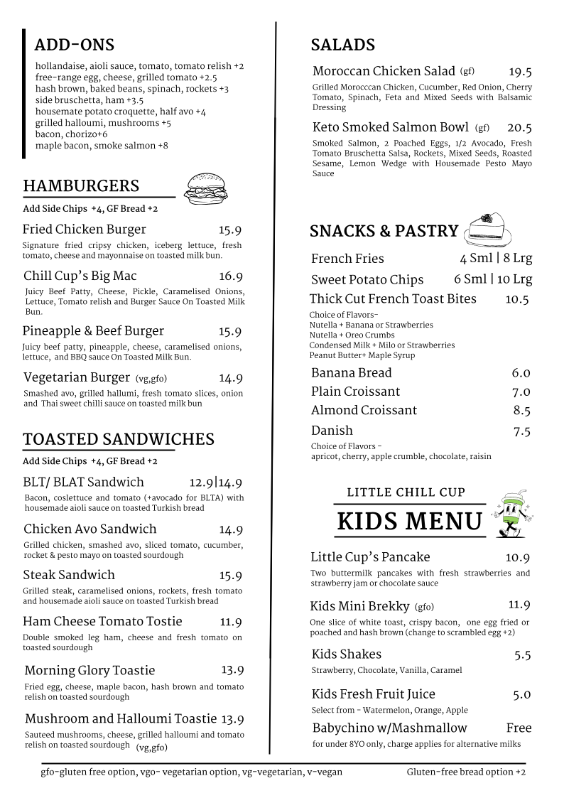 - All-Day Breakfast: Start your day right with signature dishes like the Chill Cup's Big Brekky or the indulgent Signature Fried Chicken Benny.